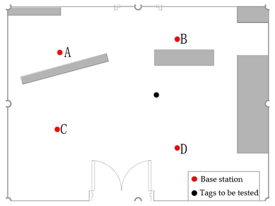 The dataset used in this study was collected in indoor environments using The DW1000 wireless radio frequency chip is manufactured by Decawave, a company based in Dublin, Ireland, covering channel impulse response (CIR) information under both non-line-of-sight (NLOS) and line-of-sight (LOS) conditions. Figure 6 illustrates the layout of the indoor data collection site, where the red dots represent the preset positions of the localization base stations, and the black dots represent the fixed positions of the tags designated for testing. To record data under different line-of-sight conditions, the base station devices were placed at locations A, B, C, and D to capture measurement results under NLOS and LOS conditions. Under these two propagation conditions, 2000 measurements were performed in each environment.