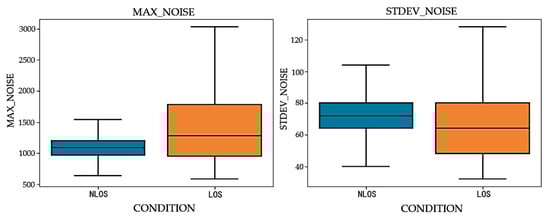 Based on the data collected under different visibility conditions, the distribution of maximum noise and noise standard deviation is plotted, as shown in Figure 7. From the box plot, it can be observed that in both non-line-of-sight (NLOS) and line-of-sight (LOS) environments, the parameters of maximum noise and noise standard deviation exhibit a high degree of similarity.