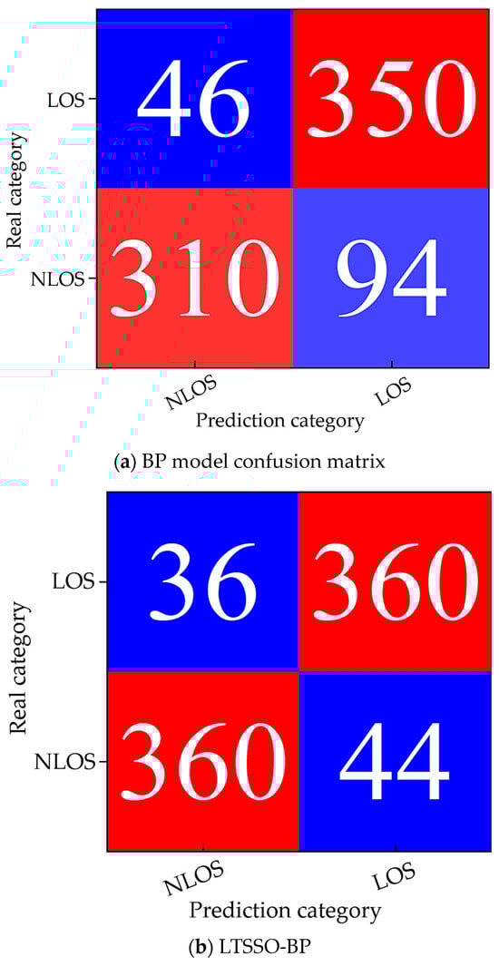 The confusion matrix plots for the BP model and LTSSO-BP model, respectively, are shown in Figure 12. It can be observed that the LTSSO-BP model exhibits a significant improvement in the classification accuracy of signal propagation states compared to the original BP model, which generally meets the basic requirements for accurate classification.