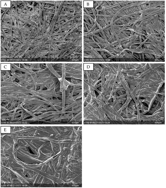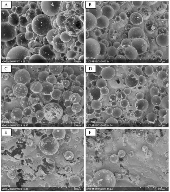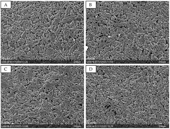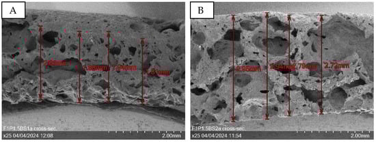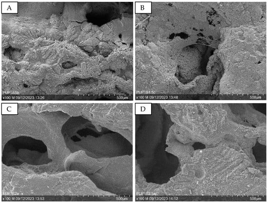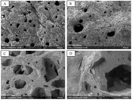 Figure 9 presents SEM images at 100× magnification, illustrating samples with varying sugar amounts. Increased sugar content enlarges the holes in the structure, as seen in Figure 9A,B (PUP1S1-1.5) compared to Figure 9C,D (PUP1S2-2.5).
