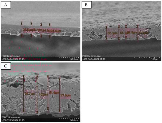 Cross-section of P30C0a (A) at 600× magnification with a mean layer thickness of 25.9 µm, P30C4c (B) at 400× magnification with a mean layer thickness of 53.9 µm, and P30C16c (C) with a mean layer thickness of 94.5 µm.