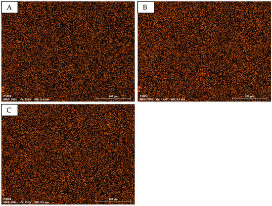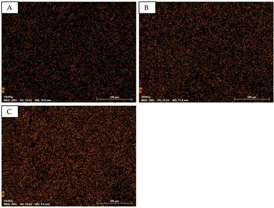 EDS analysis at 200× magnification focuses on the element sulfur (S) for PEDOT:PSS detection, as the organic materials (micro cellulose, PVA, PEDOT:PSS) contain carbon (C), nitrogen (N), and oxygen (O), which are not indicative of PEDOT:PSS. Sulfur is detectable in both PEDOT and PSS. Figure 5 shows S-mapping for samples with varying PEDOT:PSS content (P10C4, P20C4, and P30C4), indicating a relatively uniform distribution of S across all samples, with no significant increase in mapping points with higher PEDOT:PSS concentrations.