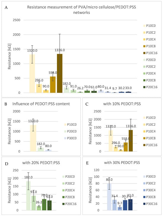 Resistance measurement of PVA/micro cellulose/PEDOT:PSS network shows not only a decrease in resistance with increasing PEDOT:PSS content but also due to the addition of micro cellulose up to a certain degree and the saturation of the samples. (A): Overview of all samples; (B): Influence of PEDOT:PSS content; (C): Samples with 10% PEDOT:PSS and different micro cellulose contents; (D): Samples with 20% PEDOT:PSS and different micro cellulose contents; (E): Samples with 30% PEDOT:PSS and different micro cellulose contents.