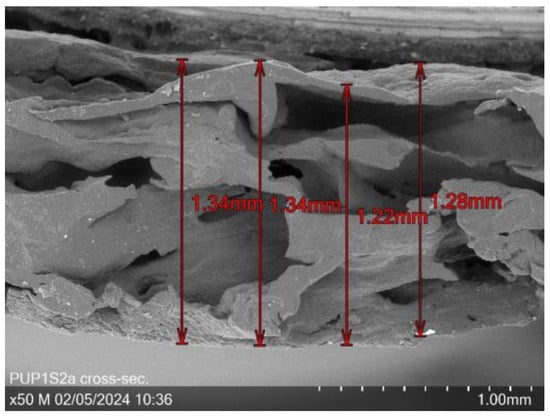 Figure 10 shows a cross-section of sample PUP1S2 at 50× magnification, revealing a mean thickness of 1.3 mm and visible channels or cavities.