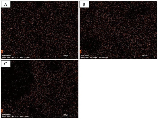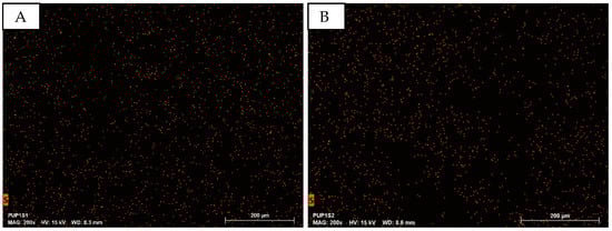 EDS analysis at 200× magnification focuses on sulfur (S), characteristic of PEDOT:PSS. Figure 11 shows EDS mapping for PUP1S1 (A) and PUP1S2 (B), with no variation in the number of mapping points, indicating constant PEDOT:PSS concentration.