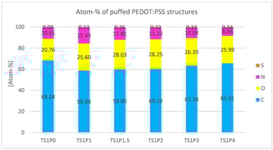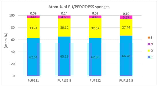 The PUP1S1-2.5 samples display the largest measured pores among all tested samples. These sizable pores likely account for the notably lower presence of sulfur observed in the EDS analysis (Figure 11) compared to all other samples. The enhanced porosity allows X-rays to penetrate the sample more deeply, potentially resulting in a lower signal for lighter elements such as sulfur. Moreover, it can be hypothesized that the combination of polyurethane (PU) and PEDOT:PSS results in the encapsulation of PEDOT:PSS within the PU matrix. This encapsulation phenomenon may create a physical barrier, limiting the accessibility of X-rays during EDS analysis and hindering effective interaction with elements present in PEDOT:PSS, particularly sulfur. The combination of increased porosity, the inherent limitations of EDS in detecting light elements at higher depths, and the potential encapsulation of PEDOT:PSS in PU may all contribute to the challenge of accurately quantifying sulfur in this particular sample.