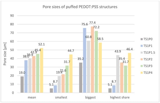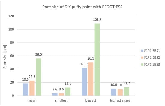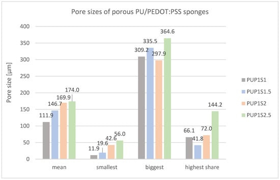 Figure 13 presents pore size measurements of PU/PEDOT:PSS sponges. Increasing sugar content enlarges the mean pore size from 111.9 µm (PUP1S1) to 174.0 µm (PUP1S2.5). Thereby, especially the smallest pores grow from 11.9 µm to 56.0 µm.