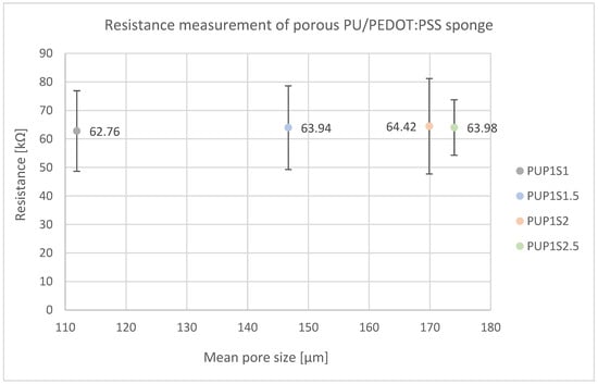 Resistance measurement of porous PU/PEDOT:PSS sponges shows no difference in electrical resistance with different sugar contents and thus resulting pore sizes.