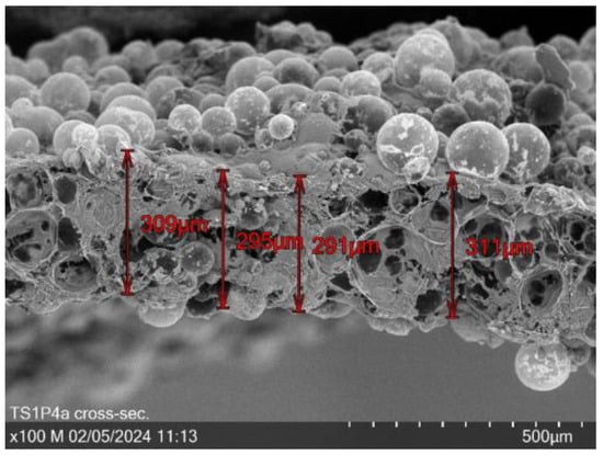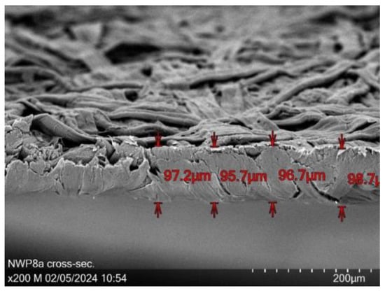 Microscopic imaging was performed utilizing the TM4000 Plus scanning electron microscope (SEM) from Hitachi High-Tech Europe GmbH (Krefeld, Germany). Both longitudinal and cross-sectional images were acquired at multiple magnifications to facilitate a thorough and detailed analysis. Cross-sectional imaging included meticulous thickness measurements to ensure accuracy. Furthermore, elemental analysis was conducted using the energy dispersive X-ray spectroscopy (EDS) unit from Bruker Corporation (Billerica, MA, USA), precisely at 200× magnification, to deliver a detailed elemental composition at a specific measurement point.