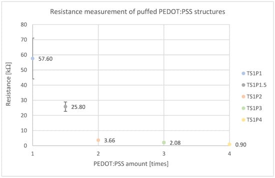A PEDOT:PSS content of 200% (TS1P2) is necessary for adequate conductivity. The most significant decrease in electrical resistance occurs between samples TS1P1 (57.6 kΩ) and TS1P2 (3.66 kΩ), indicating a percolation threshold between 100% and 200% PEDOT:PSS content relative to Tubiscreen EX-TS-FF. Beyond this point, further addition only marginally reduces resistance, suggesting saturation.