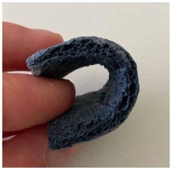 Figure 8 shows the produced PU/PEDOT:PSS sponges and their bendability. The sponges are stiff, brittle, and significantly thicker than other porous structures, with no noticeable differences in touch and bendability between samples with different PU/PEDOT:PSS to sugar ratios.
