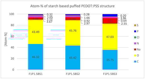The thickness of starch-based puffed PEDOT:PSS structures can be controlled by adjusting the amount of baking soda in the mixture. Sample F1P1.5BS3, for instance, has the highest layer thickness of all produced samples, which is not even measurable using the applied method. Moreover, pore size increases with higher baking soda content, though not reaching the pore size of PUP1S1-2.5. The presence of sizable pores is also the reason for the low presence of sulfur during EDS mapping.