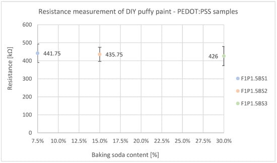 Puffy printing paste can also be made by mixing flour, baking soda, water, and a small amount of salt. Instead of adding water, the doped PEDOT:PSS solution can be added. In that way, flour and doped PEDOT:PSS are mixed in a ratio of 1:1.5, and baking soda is added to that mixture in different quantities (7.5, 15, and 30%), resulting in the following samples (Table 4):