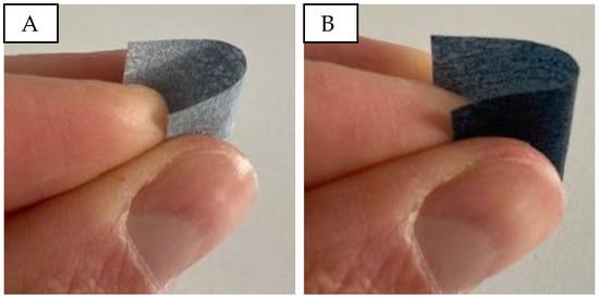 The visual and haptic assessment indicates that samples without micro cellulose resemble a thin, transparent film. The addition of micro cellulose imparts a paper-like texture and enhances structural integrity. However, an excessive micro cellulose content (from 8% onwards) results in brittleness, causing the material to break easily upon bending. Figure 2A demonstrates the bendability of a sample with 20% PEDOT:PSS and 2% micro cellulose. In contrast, a sample with 16% PEDOT:PSS (Figure 2B) lacks flexibility and breaks when folded.