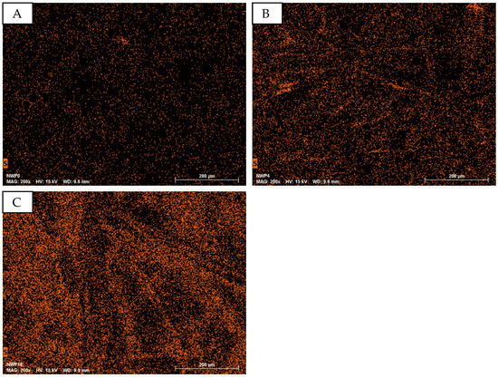 EDS mapping of the element sulfur at different PEDOT:PSS but same micro cellulose content in different PVA/micro cellulose/PEDOT:PSS samples. (A): P10C4; (B): P20C4; (C): P30C4.