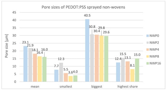 Lastly, porous non-wovens are subjected to a spraying process with doped PEDOT:PSS (DMSO + glycerol), employing an increasing number of spraying layers (2, 4, 8, 16). Upon drying, samples sprayed with 8–16 layers exhibit a softer texture compared to those with 2–4 layers. NWP16, in particular, feels as if not completely dried through, attributed to the glycerol and its water-binding properties. Independently of the number of spraying layers, all samples of NWP2-16 remain thin. Microscopic examination reveals the gluing together of individual filaments with an increasing number of spraying layers. However, porosity measurements indicate the sustained presence of pores, albeit decreasing in size. Notably, NWP16 exhibits the smallest mean pore size of all measured porous structures (excluding PVA/micro cellulose/PEDOT:PSS structures) at 16 µm.