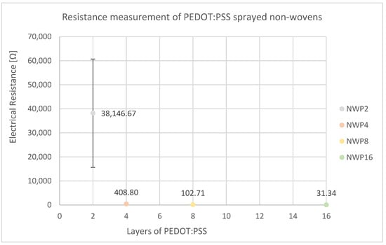 Resistance measurement of PEDOT:PSS sprayed non-wovens shows that resistance decreases with the number of sprayed layers.