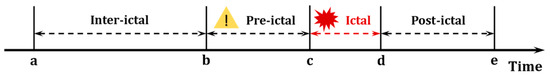 The HUP dataset [23], collected by the Hospital of the University of Pennsylvania, contains intracranial EEG (iEEG) signals from 58 patients diagnosed as drug-resistant epilepsy. Each of the 58 subjects underwent iEEG with subdural grid, strip, and depth electrodes (electrocorticography (ECoG)) or purely stereotactically placed depth electrodes (sEEGs). Since each patient’s epilepsy type may not be the same, a patient-specific study is necessary [24]. We chose the ECoG signals of three de-identified patients, HUP65, HUP88, and HUP89, to be used in the experiments. Details of the dataset are provided in Table 2. The data for each patients include three ictal and two inter-ictal segments, stored in EDF format. Each ictal segment includes recordings from two minutes before the seizure onsets, which were viewed as the pre-ictal period in this study. Therefore, data of each patient can be categorized into three periods: pre-ictal, ictal, and inter-ictal. Figure 1 illustrates the different periods in EEG data collected from epileptics.