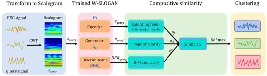 According to the above consideration, we put forward an unsupervised EEG clustering approach based on latent prototypes. Its schematic is briefly illustrated in Figure 2. First, train a W-SLOGAN from the EEG dataset to learn a generator, a discriminator, an encoder as well as the latent prototype that are responsible for each cluster. Given a query signal, transform it with continuous wavelet transform to a scalogram . Wavelet transform is an effective technique to analyze the local characteristics of non-stationary signals, offering both time domain resolution and frequency domain resolution. Then, utilizing the trained W-SLOGAN, calculate three levels of similarities separately between (i) the latent space representation of the query signal and the latent prototype of each cluster, (ii) scalogram of the query signal and the baseline scalogram of each cluster, and (iii) the deep feature map (DFM) of the query signal and the baseline deep feature map of each cluster. Obtain the compositive similarity between the query signal and the prototype of each cluster by incorporating the above three levels of similarities. Finally, convert the compositive similarity to a probability with the SoftMax function, which enables us to assign a cluster for the query signal.