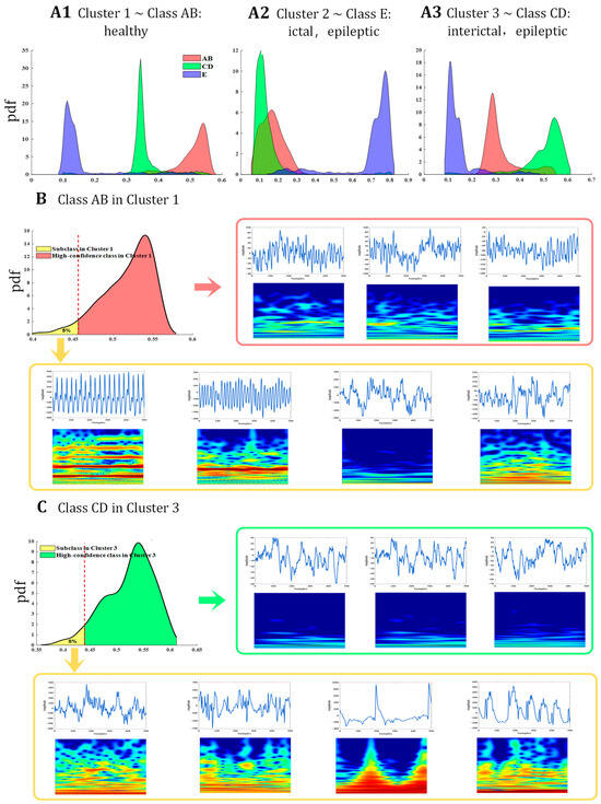 Clustering results and intra-class diversity. (A1–A3) show the probability density functions for samples belonging to Cluster 1, Cluster 2, and Cluster 3, respectively. (B) shows the probability density function of Class AB samples clustered into Cluster 1, several high-probability samples with their scalograms (in the upper row), and several low-probability samples with their respective scalograms (in the lower row). (C) shows the probability density functions of Class CD samples clustered into Cluster 3, several high-probability samples with their scalograms, and several low-probability samples with their scalograms (in the lower row).