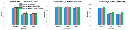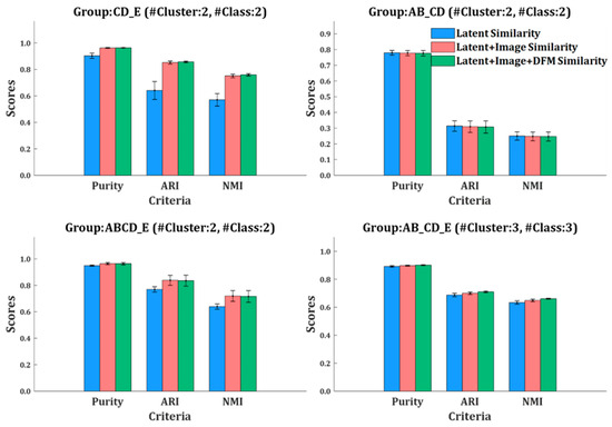 Figure 7 and Figure 8 show the bar charts of the three external clustering indexes for clustering using different kinds of similarities on the Bonn dataset and the HUP dataset, respectively. Compared to using a single latent representation similarity, the inclusion of image similarity significantly improved the clustering performance in most experimental groups. In the Bonn dataset, the average Purity, ARI, and NMI increased by 2.18%, 11.92%, and 13.04%, respectively. In the HUP dataset, those three indexes averagely increased by 1.70%, 6.20%, and 6.36%, respectively. The improvement in the performance implies that the scalogram has the potential to capture the time-frequency characteristics of different EEG signals. However, compared to the combination of latent representation similarity and image similarity, the inclusion of DFM similarity has little effect on the improvement in clustering performance. In the Bonn dataset, the three indexes increased by 0.1%, 0.37%, and 0.66%, respectively.