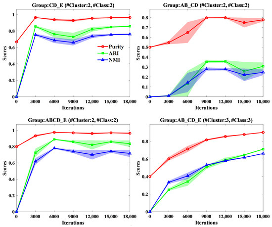 We investigated the impact of the number of iterations during the training on the clustering performance of the W-SLOGAN model. We evaluated the clustering performance of the proposed approach on the two datasets separately when the model was iterated 0, 3000, 6000, 9000, 12000, 15,000, and 18,000 times, respectively. The results are shown in Figure 9 and Figure 10. It is shown that, in most groups, a fairly good clustering performance was achieved by 9000 iterations. Before that, the performance increases rapidly with the increase in the iteration number, whereas after that, it changes smoothly. Nevertheless, for part of groups such as AB_CD_E, the clustering performance continues to increase with the increase in the iteration number.