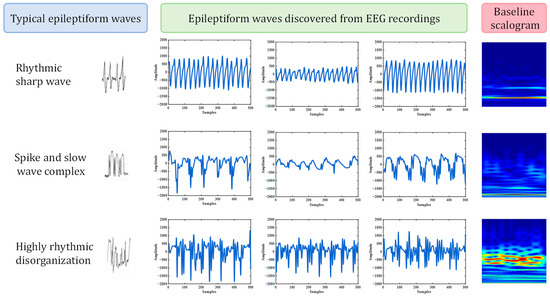 Figure 11 shows the three types of epileptiform waveforms and the corresponding clusters that resulted from our approach. On each row are displayed the characteristic waveform of a type of epileptiform discharge, three epileptiform waves of that type that were clustered into a same cluster found from the iEEG recordings by our approach, as well as the baseline scalogram of that cluster.