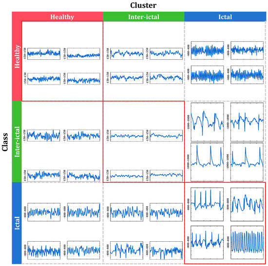 The cross-analysis of clustering and classification has the potential to discover interesting knowledge, including multiple labels of data. Taking the group AB_CD_E of the Bonn dataset as an example, Figure 12 shows the class labels and clustering results of several samples. Samples in each row belong to a same class and those in each column are clustered into a same cluster. Each grid displays four samples. Row 1 and column 1 both correspond to Class AB, i.e., healthy; Row 2 and column 2 both correspond to Class CD, i.e., inter-ictal; and Row 3 and column 3 both correspond to Class E, i.e., inter-ictal.