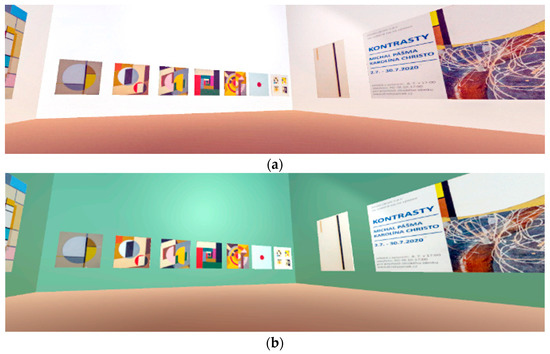 Methods in the issue of digitizing objects, especially works of art, are derived from work with colors. The digitization of art and reproduction of works of art in a digital, online, or VR environment emphasizes the realistic reproduction of color, material, and structure [17,18,19]. These attributes were also considered when creating realistic digital twins of the artworks used for this experiment. Emphasis was therefore placed primarily on the accurate color production of paintings painted using the technique of acrylic paints on canvas. ColorChecker Classic from X-Rite s.r.o. Vyškov, Czech Republic was used for realistic digital reproduction [19]. The RGB color model was mainly used to modify the color environment of the virtual art gallery. Digital display devices use the RGB color model. The three primary colors of this model (RGB) in absolute values are the source for measuring the effect of colors on users in this study. As part of the color modification of the VR environment, there were transitions of the colors Green Lima (G/Lima), Magenta (M), Magenta Plum (M/Plum), Magenta Purple (M/Purple), Blue Purple (B/Purple), and White (W). In the case of measuring the influence of color tonal changes, the application of the L*a*b* color model is necessary. However, this study is focused on analyzing the influence of the absolute values of the primary colors of the RGB color model.