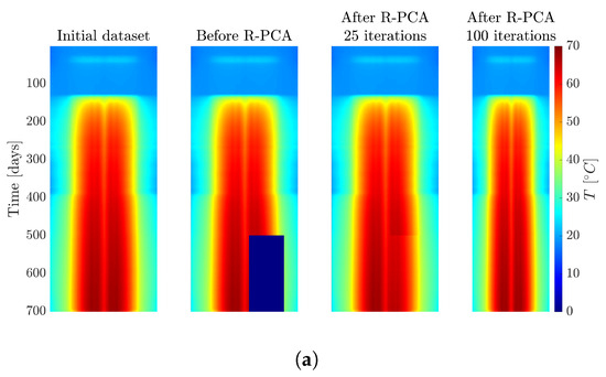 SVT is a method used for missing data imputation, like R-PCA. It operates by shrinking singular values towards zero while preserving dominant ones through optimization. This captures a low-rank structure in the data, making it useful for estimating missing values while maintaining data integrity. Both methods were efficient in our case study and yielded similar results, with R-PCA being more practical for implementation on our system architecture. The raw data obtained directly from the sensors are organized in a tabular format, recording daily temperature readings for each sensor. Recognizing the time dependency inherent in the data, this tabular information can be transformed into an image, where the rows represent the temperature’s evolution over time and the columns represent different point measurements in the optical fiber sensor. With this transformation, we can then apply various techniques to the resulting image. For instance, Figure 3 considers a synthetic experiment conducted on the acquired data. In particular, Figure 3a takes the original image of measurements (left) and removes a large portion from it (middle-left). Then, the R-PCA algorithm is applied to the image with anomalies. The resulting images when the iterative process reaches 25 and 100 iterations are shown as well (middle-right and right, respectively), ultimately producing an error of about . Similarly, Figure 3b repeats the experiment, but in this case, the portion of the image removed is randomly distributed over the whole image, instead of a large concentrated portion. This approach also yields errors of approximately .