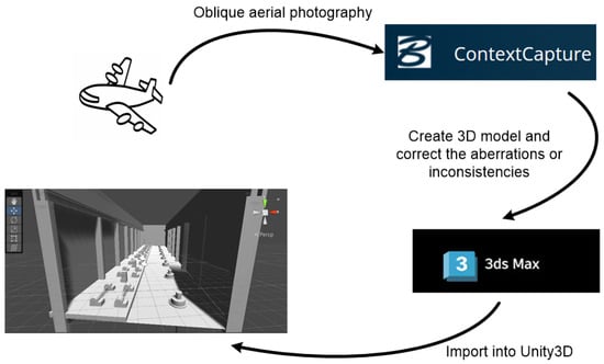 Context Capture generates 3D models from image sets using unmanned aerial vehicle (UAV) oblique photography modeling technology. This technology proves particularly efficient for rapid 3D reconstructions of real-world objects. The resulting models are then refined and optimized in 3Ds Max (20.0.0.966), a widely used 3D modeling software, before being imported into Unity3D.