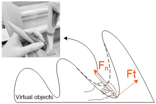Depiction of haptic force feedback in virtual inspection system: normal force and tangential force.