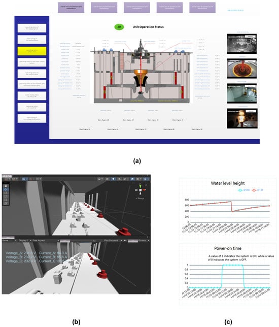 In 3Ds Max, we have revised the initial model provided by the pump station, which originally utilized the UAV oblique photography modeling technology. This model can be imported into Unity3D, where it is integrated with VR devices through C# scripting. Using the real physical surface information, when the haptic devices collide with the objects in virtual space, they can imitate haptic force feedback for operators. Figure 6 shows the comparison of the system interface from the traditional monitor system with virtual inspection system. Figure 6b shows the operator interface of the virtual inspection system in Unity3D. The traditional system is shown in Figure 6a. Figure 6c shows the data visualization.