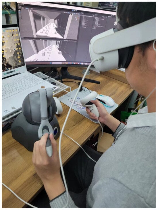 This experiment employed task-based psychophysical methods to analyze subjective differences between the various systems under investigation. As shown in Figure 7, subjects were seated at a table, wearing a VR headset, and using a haptic device to interact with virtual objects within the virtual environment. We recorded subjects’ performance, including the time taken and accuracy achieved in completing the designated tasks.