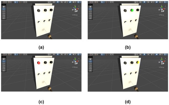 In the formal experiment phase, subjects experienced the virtual environment visually and haptically. They were instructed to press three buttons on the virtual electrical cabinet within 5 min, following a specific order to simulate an inspection process. The corresponding indicator light on the cabinet illuminated only when the haptic device model touched the button and the designated button on the haptic device was pressed simultaneously. If the subject pressed the designated button but the indicator light failed to illuminate, the task was deemed unsuccessful. Figure 8 shows the different states of the virtual electrical cabinet.