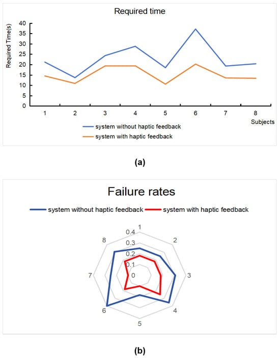 The required time is depicted in the line chart of Figure 9a. The haptic force feedback system showed less required time with an average of 15.32, while the system without haptic force feedback showed more required time with an average of 23.01. The failure rates of the two system are shown in the radial chart of Figure 9b. It is also shown that the system with haptic force feedback has a lower failure rate than the one without.