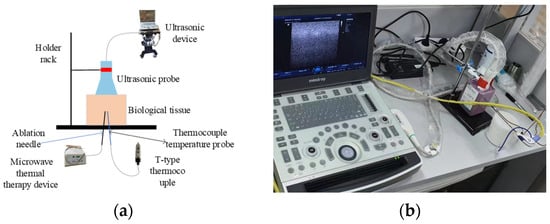 The MH experimental setup includes an MH device and temperature-measurement and ultrasound-detection equipment (Figure 1). The specific MH device used is the MH-IY model manufactured by Beijing Muheyu Electronics Co., Ltd. (Beijing, China), operating at a frequency of 2450 MHz for the ablation needle. Temperatures were measured using a T-type thermocouple WRNT-01 produced by Kapson Company (Croydon, UK), offering an effective measurement range of −200 °C to 260 °C, with an accuracy of 0.01 °C and a measurement frequency of once per second. Ultrasound was detected using the M9Vet portable ultrasound diagnostic instrument from Mindray Company, set to small organ mode with a sampling frequency of 17.25 MHz. Fresh ex vivo pork tissue (pork tissue structure and dielectric constant are similar to those of human tissue []) and phantom materials were used. The pork tissue was obtained from a pig slaughtered on the day of the experiment at a local supermarket. The tissue was cut into cubic pieces of approximately 6 cm in length, 4.5 cm in width, and 3 cm in height; 10 pieces were selected for the experiment. The phantom materials were prepared using AW Guy’s formulation [], comprising TX-150, deionized water, polyethylene powder, sodium chloride, and a thermochromic material that changes color from purple to pink when the temperature exceeds 40 °C. After thorough mixing using an ultrasonic vibrator, the mixture was placed in a sterile culture medium to form a cubic structure measuring 5 cm in length, 5 cm in width, and 9 cm in height.