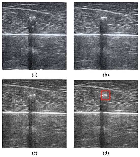 The ultrasound video file, recorded in .AVI format with a duration of 8 min and a frame rate of 30 frames per second, was processed along with the corresponding temperature-probe-recorded heating curve. The images from each frame of the video file were captured, and the time dimensions of the ultrasound images were fused to align the image frequency with the temperature sampling frequency (Figure 2c). Subsequently, each image underwent mean filtering [] to remove speckle noise. A region of interest measuring 64 × 64 pixels, centered around the temperature probe, was selected for further processing, as indicated by the red box in Figure 2d.