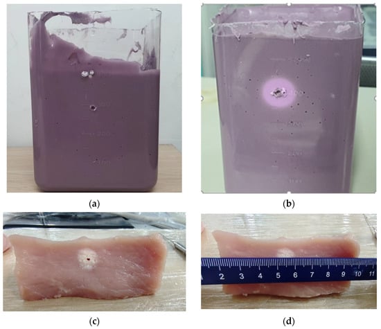 After the thermo-ablation experiments, a temperature rise area of approximately 1 cm in diameter was observed in both the phantom and ex vivo pork tissue. In the ex vivo pork tissue, dehydration and protein deformation occurred after microwave radiation (Figure 6a,b). In addition, the color of the phantom changed from purple to pink, as shown in Figure 6c,d.
