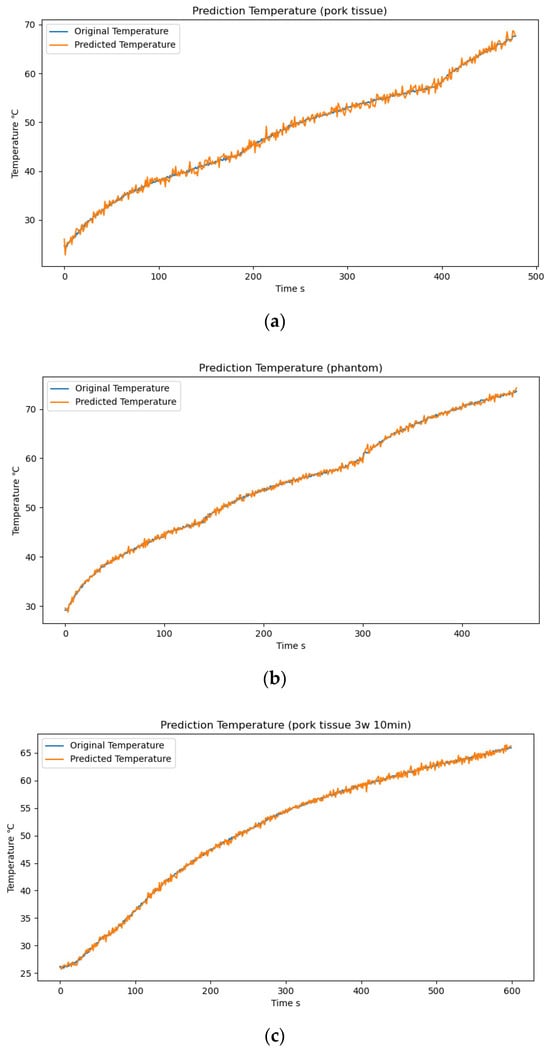(a) Temperature–prediction curve for ex vivo pork tissue; (b) temperature–prediction curve for the phantom model; (c) temperature–prediction curve for ex vivo pork tissue (3 W/10 min); (d) temperature–prediction curve for ex vivo pork tissue (7 W/6 min).
