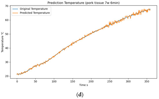To test the prediction accuracy of our neural network on biological tissue samples under varying power levels and heating times, we controlled the same experimental variables while changing only the microwave source power and heating time. We conducted prediction analyses on ten samples of fresh pork heated at 3 W for 10 min and ten samples heated at 7 W for 6 min. The temperature prediction errors were as follows: the mean prediction errors for 3 W/10 min and 7 W/6 min were 0.849 °C and 0.904 °C, respectively. The temperature prediction curves are shown in Figure 7c,d.