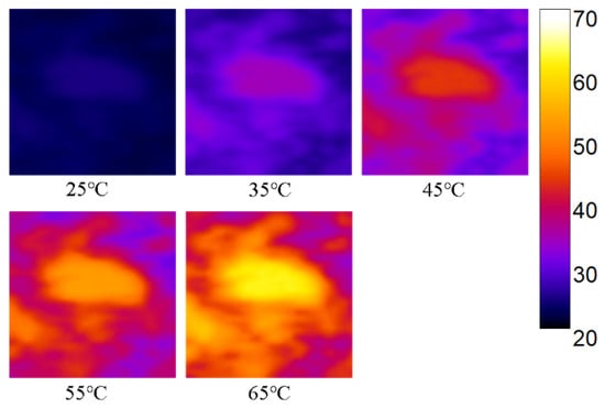 Two-dimensional pseudocolor plot of tissue temperature at 25 °C, 35 °C, 45 °C, 55 °C, and 65 °C.