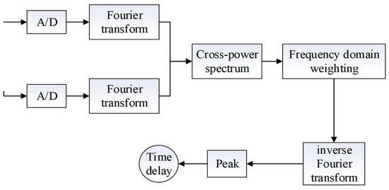 In order to overcome the shortcomings of the basic cross-correlation algorithm in the case of a low signal-to-noise ratio with a large delay estimation error, firstly, the fast Fourier transform is performed on the two received signals, respectively, to obtain the frequency domain form of the cross-correlation function of the two signals; then the cross-correlation function is weighted in the frequency domain, and the results of the weighted computation are fast Fourier inverted and converted to the time-domain form, and then peak-detection is carried out. As shown in Figure 1. The generalized cross-correlation function sharpens the peak of Rx1x2(τ) at the time delay, thus improving the delay estimation performance. The generalized cross-correlation function Rx1x2(τ) is as follows: