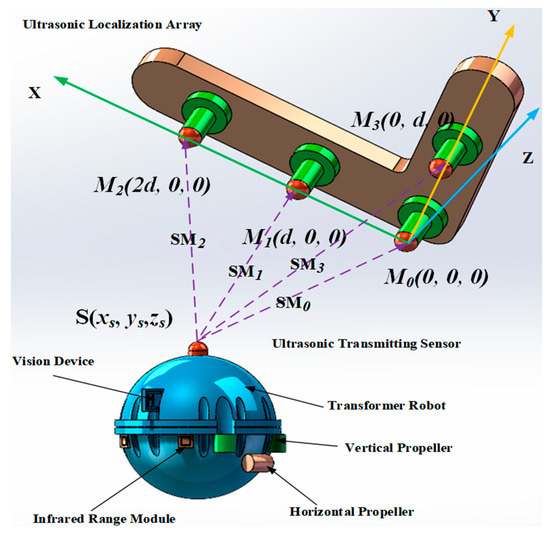 For a positional localization array consisting of M ultrasonic transducers, let the spatial coordinates of the ith transducer mi(i = 1, 2,..., M) be ri = [x,y,z]T, and let the spatial coordinates of the acoustic source rs = [xs,ys,zs]T. Let m0 be the reference origin; then the distance from mi to m0 is as follows: