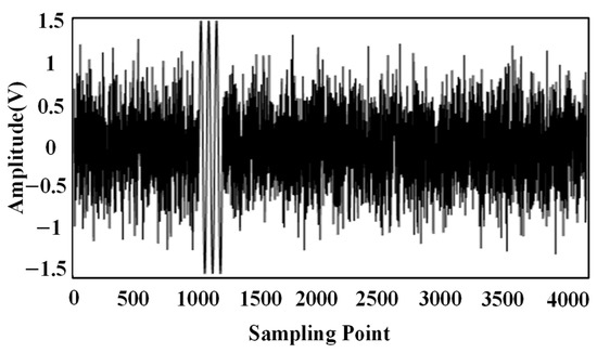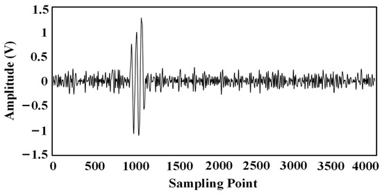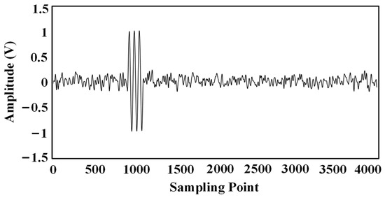 During the validation process, the emitted ultrasound signal consisted of three sinusoidal signals with a frequency of 180 kHz. The sampling frequency is 2.5 MSa/s, and the number of sampling points is 4096. In order to simulate the effect of noise on the signals, Gaussian white noise with SNR = −5 dB was added to the signals, as shown in Figure 3.
