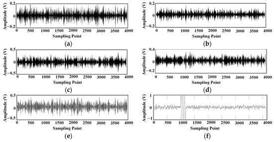 Intrinsic modal components obtained by the improved EMD algorithm decomposition: (a) IMF1; (b) IMF2; (c) IMF3; (d) IMF4; (e) IMF5; (f) IMF6.