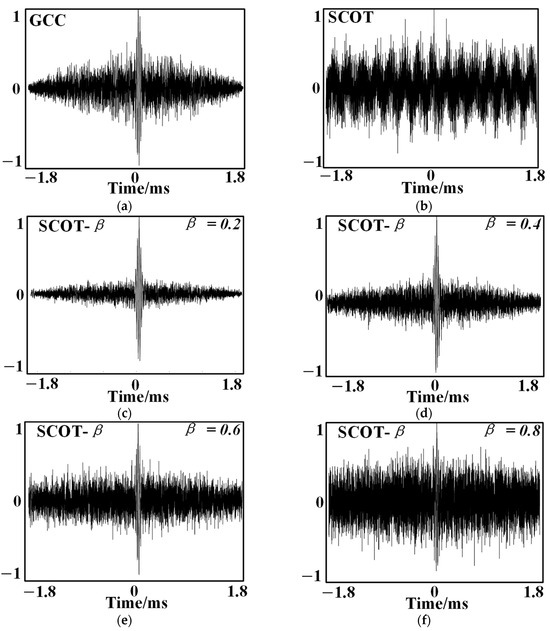 Figure 9 shows the generalized cross-correlation results for GCC, SCOT, and SCOT-β for β taken as 0.2, 0.4, 0.6, and 0.8, respectively, at an SNR of −5 dB.