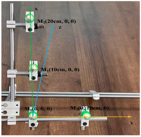 The ultrasonic array mounted inside the transformer consists of four omnidirectional waterproof piezoelectric ceramic ultrasonic probes, with one ultrasound probe at the reference origin, two ultrasound probes in the horizontal direction, and one ultrasound probe in the vertical direction, in the form of an L-shaped array. In this experiment, four sensors were selected, as shown in Figure 12. The nominal frequency of the ultrasound probes is 180 kHz, and the coordinates of the four probes are M0 (0 cm, 0 cm, 0 cm), M1 (10 cm, 0 cm, 0 cm), M2 (20 cm, 0 cm, 0 cm), and M3 (0 cm, 10 cm, 0 cm), respectively. Let the coordinates of the sound source be S (xs cm, ys cm, zs cm), the distance to the origin of the right-angle coordinate system be l0, and the distances between the sound source S and the four formants M0, M1, M2, and M3 be l0, l1, l2, and l3, respectively.