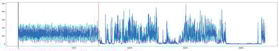 An example data profile of calculated jerk from one participant. Note: The black line marks the identified beginning of the cloud hand practice; the red line marks the identified end of the cloud hand practice.