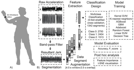 While TC is a full-body exercise, it also emphasizes the control of arms and hands [11,12]. Previous studies have suggested that wrist acceleration data are valid for describing the control of the arms and hands [13,14]. Moreover, many adapted and modified TC practices recommended for older populations or people who lack mobility are focused on upper body movement, such as seated TC [15] or wheelchair Tai Chi [16]. Thus, developing machine learning models based only on data collected from the upper body is relevant and valuable in accommodating all different types of practitioners.